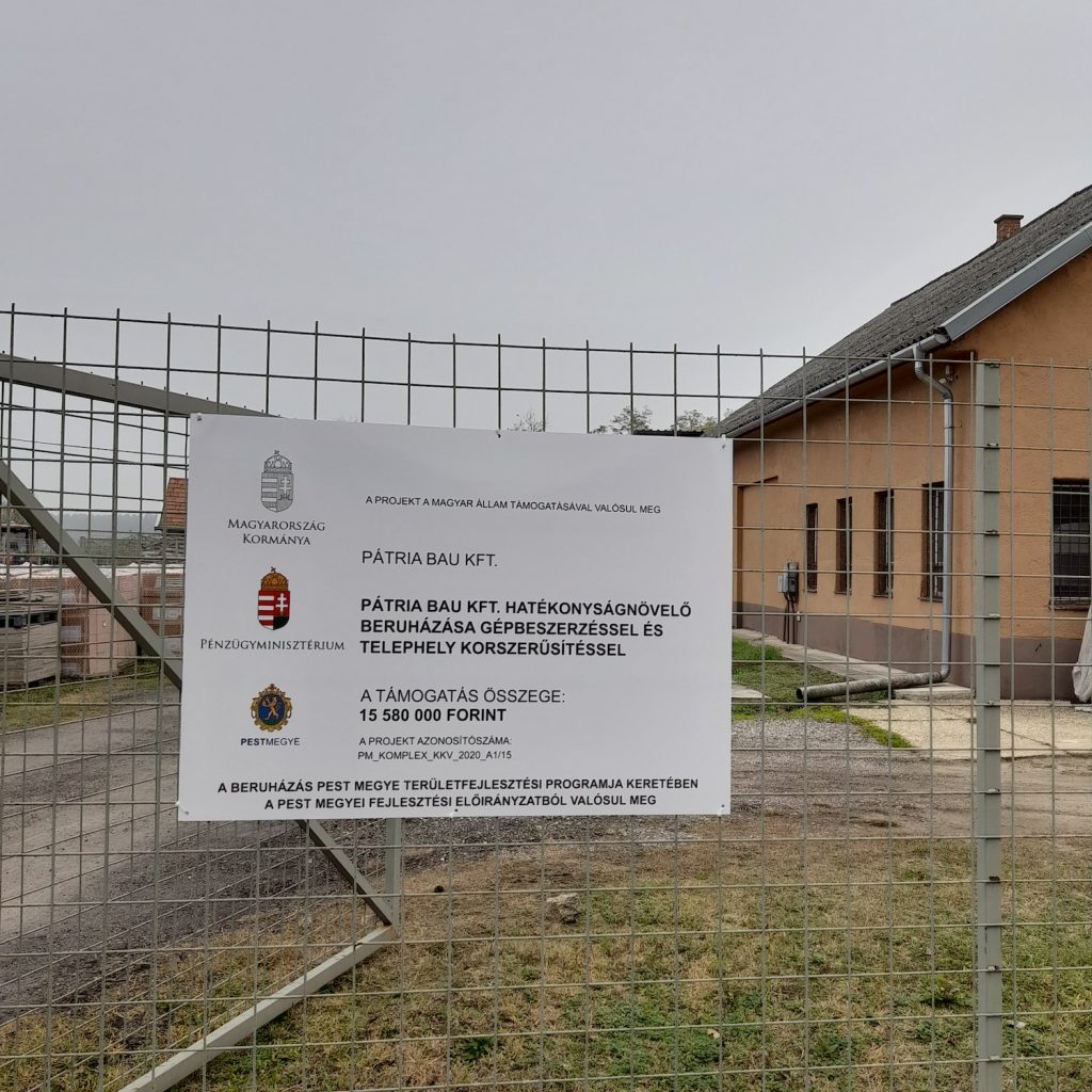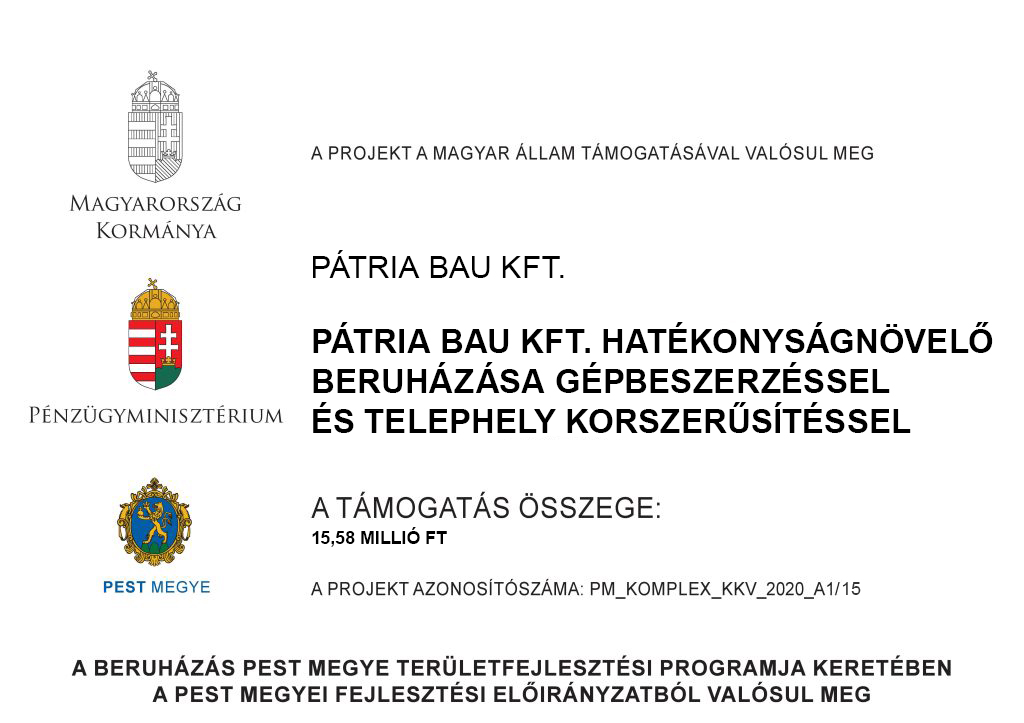 - A projekt címe: Pátria Bau Kft. hatékonyságnövelő beruházása gépbeszerzéssel és telephely korszerűsítéssel